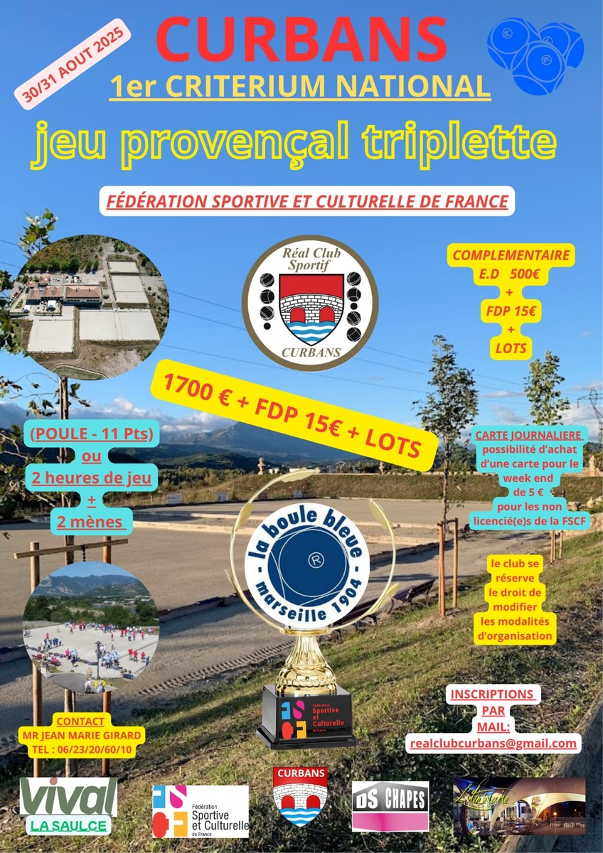 Le 1er critérium national jeu provençal FSCF aura lieu les 30 et 31 Août 2025 à Curbans basé sur 64 équipes (licences obligatoires, possibilité de licences week-end au tarif de 5 €).