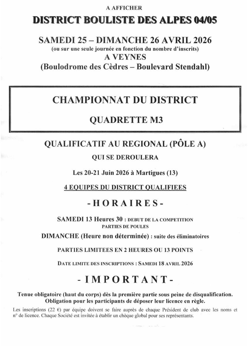 - Les joueurs qui s’engagent pour cette compétition ne pourront pas s’inscrire aux éliminatoires des quadrettes M4 en juin.